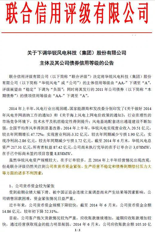 2013年5月31日,华锐风电发布公告,公司主体长期信用等级被从 AA调整为AA-;