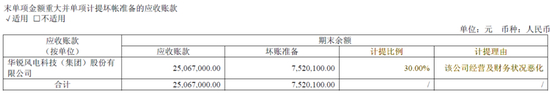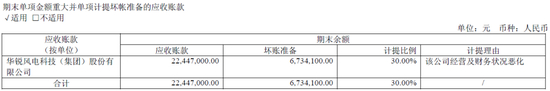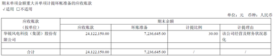 在上市后第1年(2014年)的年报中,中电电机对华锐风电的应收账款进行了单项计提,计提比例为30%,计提理由为“该公司经营及财务状况恶化”。