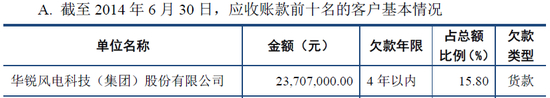 中电电机于2014年11月4日挂牌上市,在上市前的报表基准日,2014年6月末公司第一大应收账款客户是华锐风电,欠款金额为2371万元,占到了公司2014年利润的一半,账龄在4年以内。