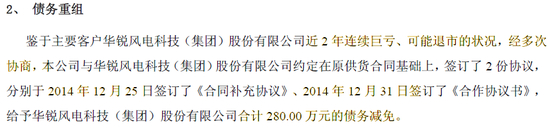 而且根据中电电机2014年年报,2014年12月,也就是上市后的第2个月,中电电机就与华锐风电签署了补充协议,给予华锐风电280万元的债务减免。