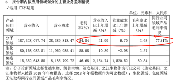 据硕世生物自己披露,其分子领域的诊断产品毛利率要超过同行业77.31%的整体水平7个百分点,达到84.84%,而被拿来做对比的上市企业包括艾德生物凯普生物、达安基因、之江生物等。