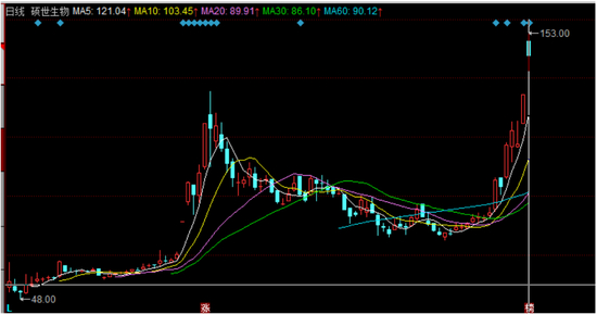 2019年12月5日,硕世生物于科创板上市,上市之初并没有受到资金追捧。上市第一天股价上涨了17%,紧接着便连跌2天,最低触及48元/股,险些跌破46.78元/股的发行价。2020年1月中下旬,硕世生物推出了新冠病毒核酸检测试剂盒后,迎来第一波短暂上涨;经过2个月回调之后,4月初迎来第二波上涨,4月24日盘中股价达到153元/股的最高水平,市值达到84亿元。