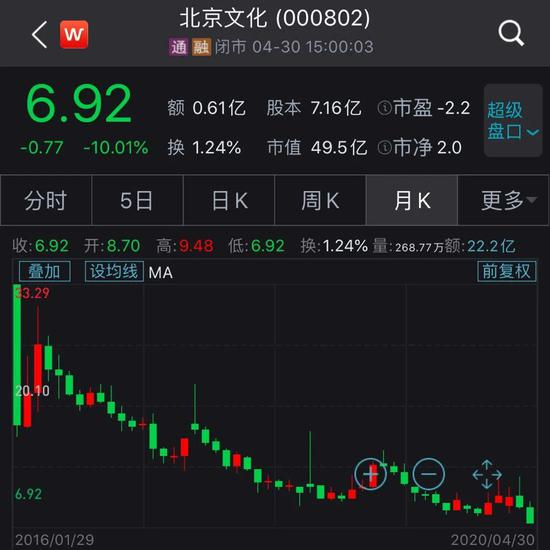 但这番解释,终究没能挽救股价。今日(4月30日)开盘,北京文化无悬念一字跌停,43万手封单。截至收盘,股价报6.92元/股,创下近六年来历史新低。