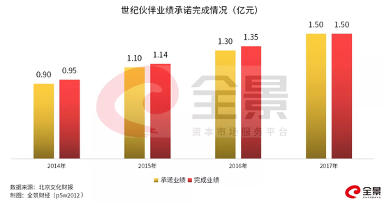 收购之际,交易方签订了对赌协议。其中,世纪伙伴承诺2014年至2017年期间净利润不低于9000万元、1.1亿元、1.3亿元、1.5亿元。对赌期内,世纪伙伴每年都刚刚完成了业绩承诺。