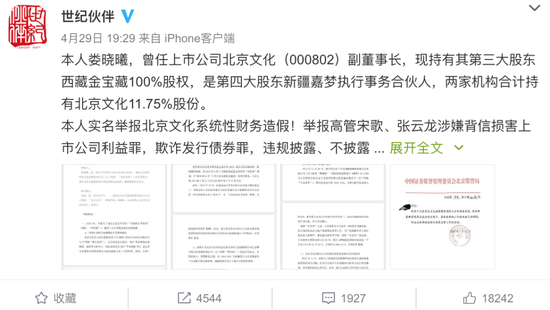 4月29日晚间,北京文化(000802)原副董事长娄晓曦通过微博“世纪伙伴”,实名举报北京文化系统性财务造假,并称董事长宋歌、副总裁张云龙涉嫌4大罪状: