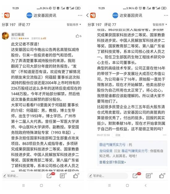 昨晚,达安基因公告称,公司董事长何蕴韶和公司董事、总经理周新宇拟合计减持上市公司股份不超过625.54万股,占公司总股本的0.79%。