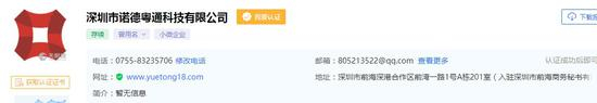 巧合的是,一家名为深圳诺德粤通科技有限公司与深圳清景在工商预留的联系方式则一模一样。天眼查显示,在其2017年年检预留的联系方式显示,电子邮箱地址为805213522@qq.com,电话也是0755-83235706。而该公司的法人和实控人也均恰好为陈立志,由诺德集团100%持股。