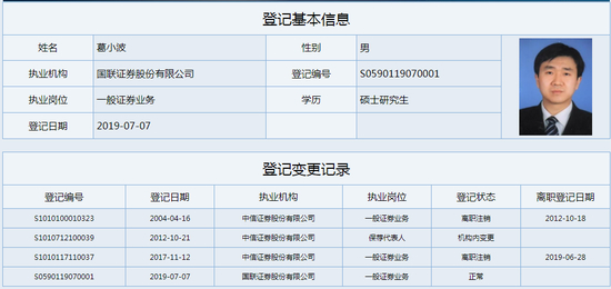 葛小波先生,49岁,清华大学流体机械及流体工程专业工学学士,管理工程(MBA)专业工商管理硕士。1997年入职中信证券,为中国首批保荐代表人,历任中信证券投资银行部经理和高级经理,A股上市办公室副主任,风险控制部副总经理和执行总经理,交易与衍生产品业务部、计划财务部、风险管理部、海外业务及固定收益业务行政负责人,执行委员会委员、财务负责人、首席风险官等职。2019年6月入职国联证券,现任国联证券执行董事、总裁兼财务负责人,兼任华英证券董事、中海基金董事。
