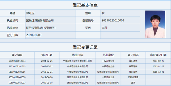 尹红卫女士,1966年9月出生。此前任中信证券深圳分公司总经理。2019年4月入职国联证券,2020年2月起任副总裁兼首席财富官,主管财富管理条线。