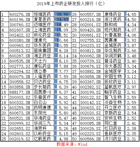 根据新浪财经上市公司研究院统计,研发投入夺得前三名的依次为恒瑞医药、复星医药、迈瑞医疗,研发投入分别为38.96亿元、34.63亿元、16.49亿元,超过10亿元的还包括上海医药、科伦药业、健康元、华东医药。超过1亿元的共130家。