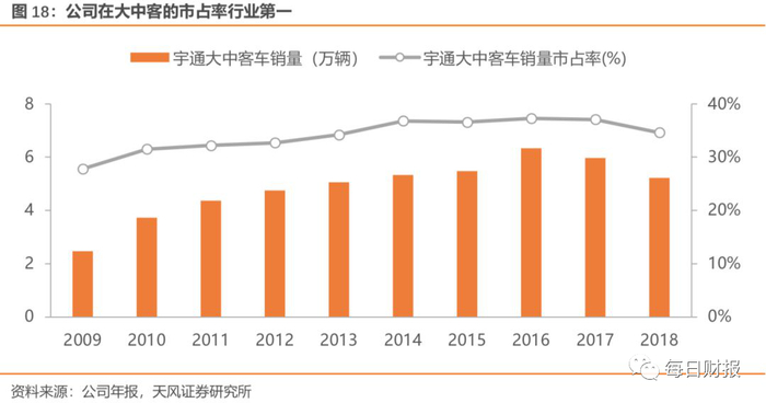 天风证券认为,在竞争壁垒和盈利能力都高的大中客领域,宇通大中客的市占率从09年的28%上升至17年的37%。18年市占率有所下滑,主要是受到了行业新进入者的影响。而如今随着研发高投入,产品竞争优势的强化,市占率反转回升,令业内对其发展态势看好。这从2019年年报中的市占率占比就已看出。