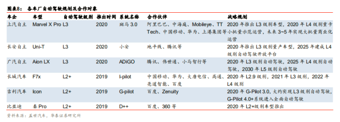 具体来说,与百度有深入合作的比亚迪、吉利、长城都已于去年分别推出了L2+级别车型秦Pro、Icon、F7x;在L3级别,广汽、长安均已于今年分别推出Aion LX、Uni-T车型,上汽集团也即将推出Marvel X Pro车型,吉利接近L3级别的车型G-Pilot 3.0同样计划于2020年推出,长城计划于2021年推出L3级别车型。