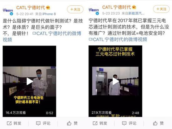 5月22日、23日,宁德时代接连发布两则实验视频,表示自己早已掌握三元锂电池通过针刺测试的技术,却不能将其视为电池安全的证明。视频内容疑似回应比亚迪在刀片电池发布会上对三元锂电池的质疑。