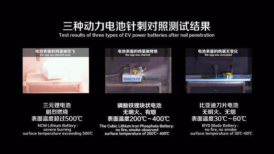 在发布会上,比亚迪公布了刀片电池针刺试验的完整视频,电池被穿透后无明火、无烟,电池表面温度仅有30℃-60℃左右。而三元锂电池却难以通过针刺实验,且在测试过程中发生燃烧,表面温度超过了500摄氏度。