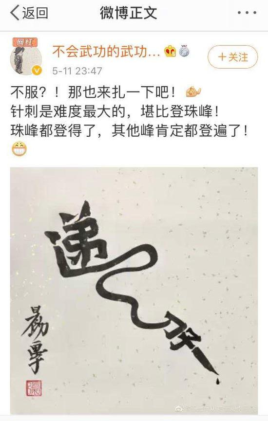当日晚,李云飞发文表示:“不服?那也来扎一下吧!针刺是难度最大的,堪比登珠峰!”