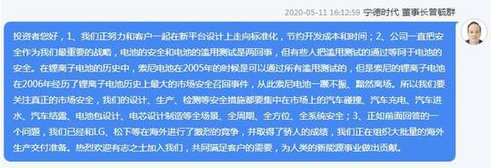 5月11日,宁德时代董事长曾毓群在年度业绩说明会表示:“有人把滥用测试的通过等同于电池安全”,并表示宁德时代的安全措施主要集中在碰撞、充电、浸水以及电池设计制造等方面。