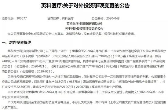 产能方面,英科医疗4月15日晚间公告,公司拟将原扩建年产98.8亿只(988万箱)高端医用手套项目变更为“英科医疗防护用品产业园项目”,并扩大投资至22.76亿元,建成投产后将达到年产210亿只(2100万箱)高端医用手套生产规模。