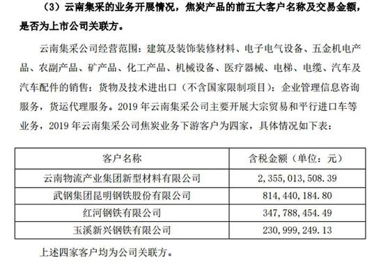 在最新的回复函中,云煤能源终于坦白:2019年云南集采公司焦炭业务下游客户为四家,全部为公司的关联方。
