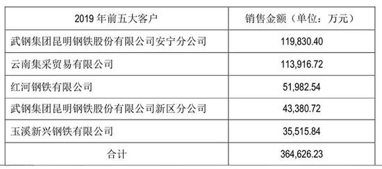 据披露,云煤能源前五大客户分别为武昆股份安宁分公司、云南集采贸易有限公司(以下简称云南集采)、红河钢铁有限公司、武昆新区分公司、玉溪新兴钢铁有限公司,销售额分别为11.98亿元、11.39亿元、5.19亿元、4.34亿元和3.55亿元。除了云南集采外,其他四家都隶属于公司控股股东昆钢控股,都是关联方。