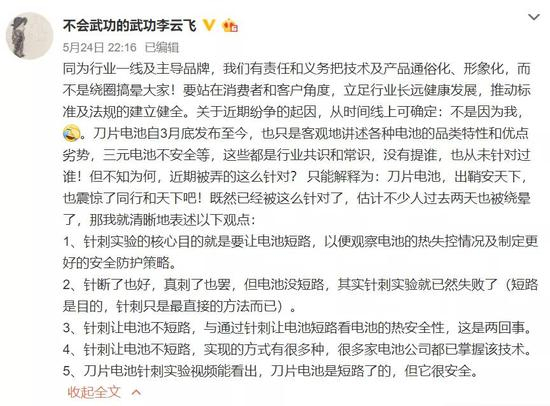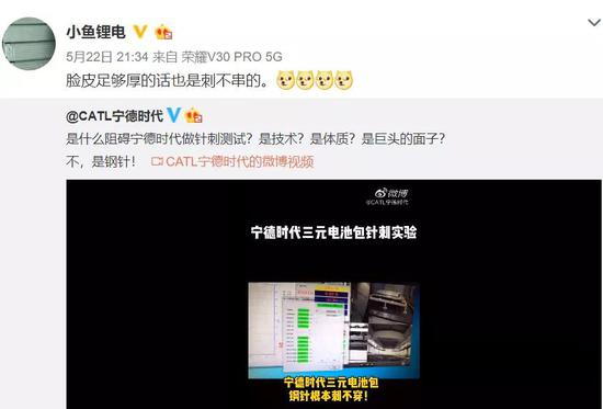 同一天,李云飞再次发博,解释了有关针刺试验的原理并质疑宁德时代实验不成功,称三元电池不安全是行业共识和常识。