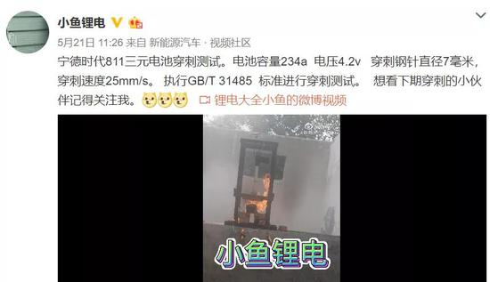 5月21日,汽车博主@小鱼锂电发布了一段宁德时代811电池的穿刺测试,途中电池爆燃。