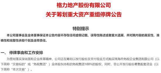5月11日晚,格力地产发布筹划重大资产重组停牌公告,拟向珠海市国资委、城建集团(为前者子公司)发行股份并支付现金,购买其持有的珠海免税集团100%股权。