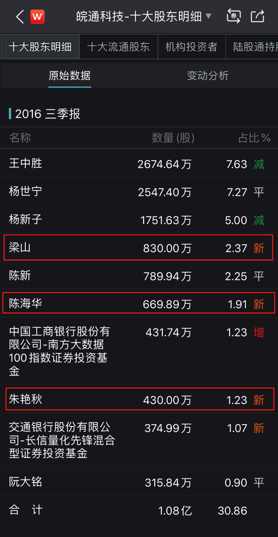 下图是皖通科技2016年第三季度末的前十大股东明细。这家股权分散的上市公司突然间迎来了三位陌生的自然人股东——梁山(2.37%)、陈海华(1.91%)、朱艳秋(1.23%),分别位居第四、第六、第八大股东。