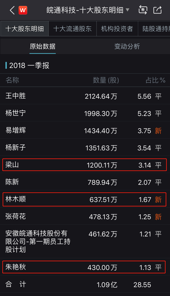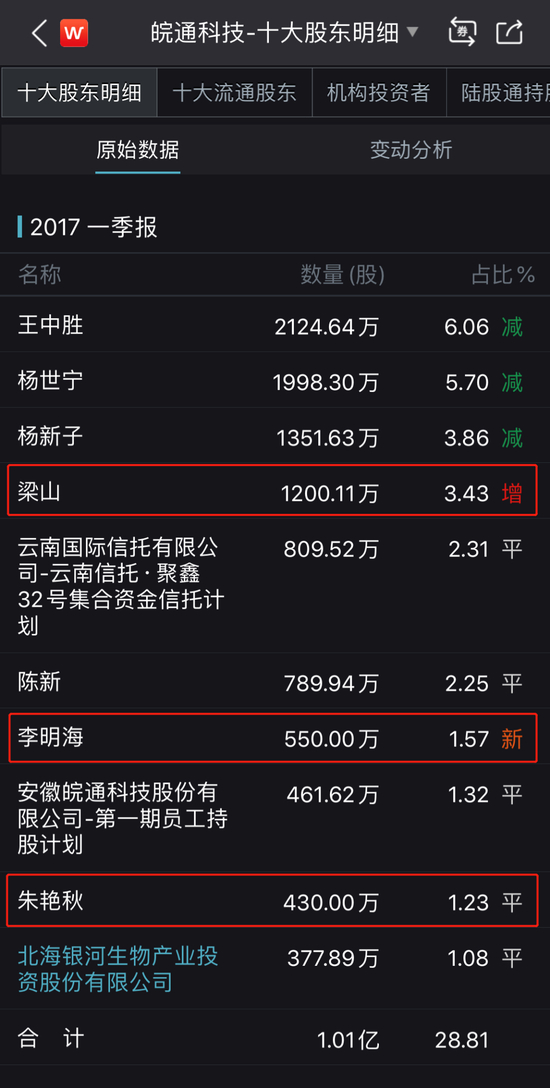 到了2017年第一季度,皖通科技的前十大股东有了少许变化。三位创始股东在减持,合计持股比例进一步下降到了15.6%,而三位牛散股东中,梁山还继续增持至3.43%,朱艳秋维持1.22%不变,之前的陈海华消失了,新进来一位李明海持股1.57%。