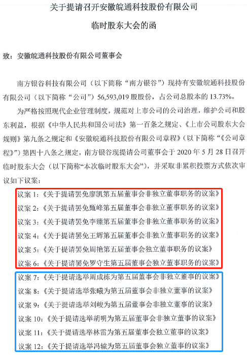 在更早前的4月22日,南方银谷以控股股东的身份,向皖通科技发出函件,提请5月28日召开临时股东大会,改选大部分现任董事会成员,其中就包括此前由他以大股东身份委派的两位董事——廖凯、甄峰。议案共计12项,前6项为罢免董事议案,后6项为选举议案。