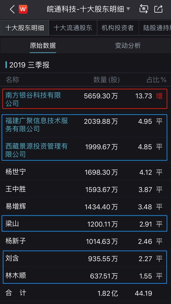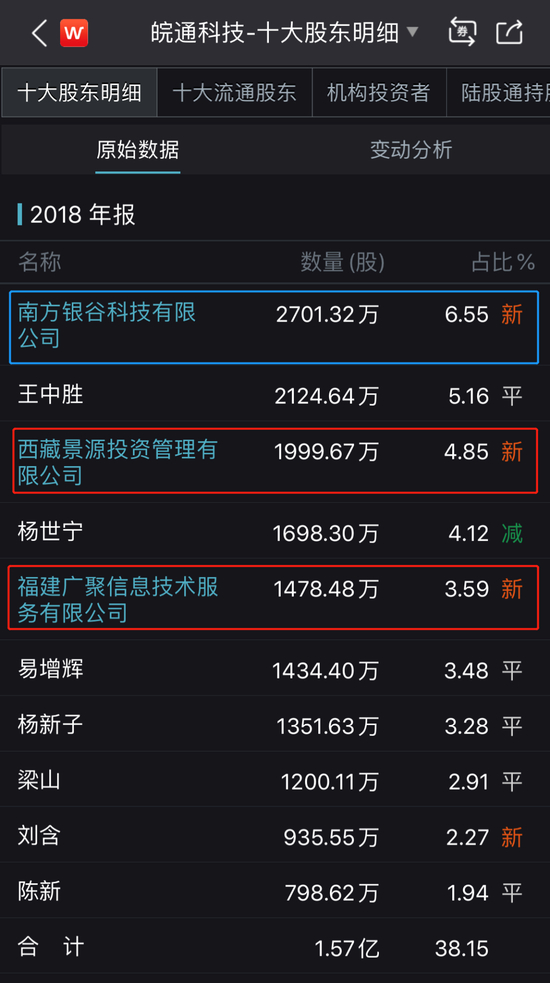 下图是2018年末皖通科技定增完成之后的前十大股东,南方银谷已经晋身第一大股东。值得注意的是,前十大股东中,出现了两家新的法人股东面孔——西藏景源、福建广聚,分别以4.85%及3.59%的持股比例位居第三、第五大股东。