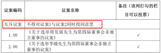 特别值得一提的是,股东大会通知要求,选举周发展与选举李臻是互斥议案,只能二选一,否则选票无效,足见双方火药味之浓烈。