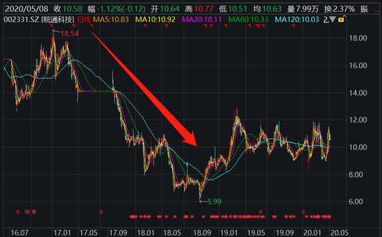 不过,不幸的是,自牛散们入场之后,皖通科技的股价便一路下行,从2017年处的18块跌到了2018年中的7块,跌幅超过60%。