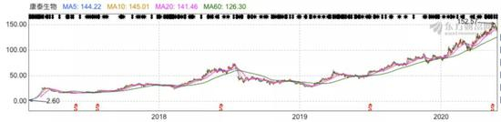 2017年2月,康泰生物上市之时,发行价为3.29元/股,上市后股价就一路攀升,截止到今天的140.78元/股,短短3年多时间,康泰生物的股价涨幅高达43倍。