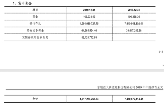 首先看资金情况。根据东旭蓝天2019年年报披露数据,2019年年末货币资金余额为47.17亿元,相比2018年的74.81亿元,同比下降高达36.94%。而到了2020年Q1,货币资金余额为41.41亿元,依然在减少。