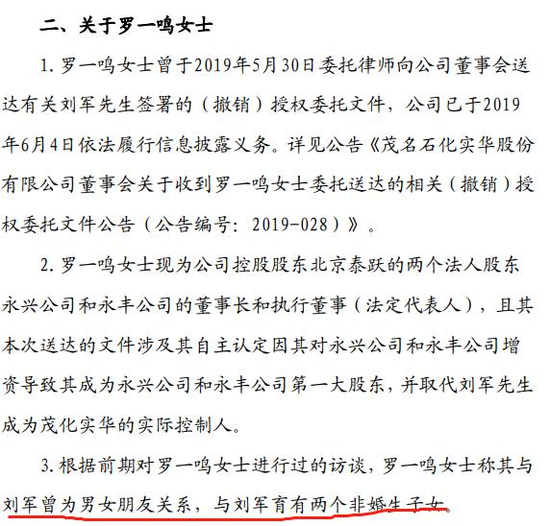 2019年5月,刘军将其拥有的对茂化实华、茂化实华控股股东北京泰跃以及北京泰跃两大股东的全部权利,委托给罗一鸣行使,要求罢免刘军妻子范洪岩的上市公司董事长职务。