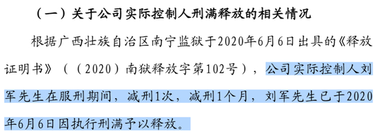 据茂化实华公告,公司实际控制人刘军在服刑期间,减刑1次,减刑1个月,刘军已于2020年6月6日因执行刑满予以释放。
