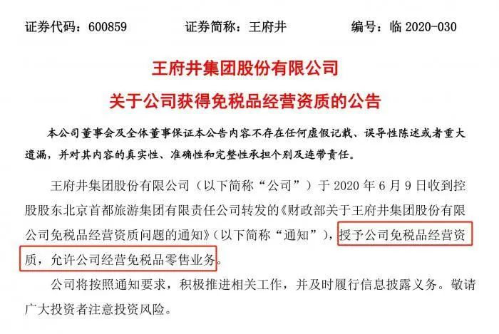 6月9日晚间,王府井(600859.SH)公告称,公司于2020年6月9日收到控股股东北京首都旅游集团有限责任公司转发的《财政部关于王府井集团股份有限公司免税品经营资质问题的通知》授予公司免税品经营资质,允许公司经营免税品零售业务。