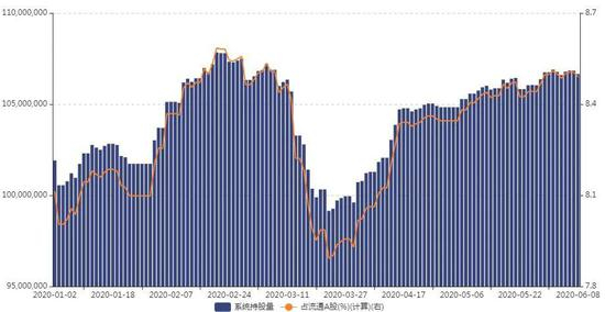北上资金持仓茅台接近历史新高水平。据Wind显示,截至6月8日,陆股通共持仓贵州茅台1.06亿股股份,占其总股本比例8.50%;持仓市值约为1500亿元,占陆股通持仓A股总市值(1.6万亿元)达9.4%,相较于二季度初显著提升。