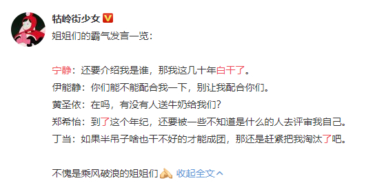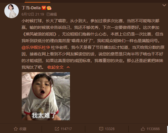 还有节目开播当晚就直接“手撕”导师的。因为质疑导师打分不公,丁当直接@导师本人,“如果这真是您的成团标准,我尊重您的决定。那么还是赶紧把妹妹我淘汰了吧。”