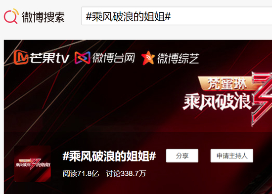 百度指数显示,从6月12日开始,“乘风破浪的姐姐”在全网的热度开始狂飙,搜索指数上涨了79倍。在微博上,#乘风破浪的姐姐#话题阅读量已经突破70亿次,讨论超过338万。
