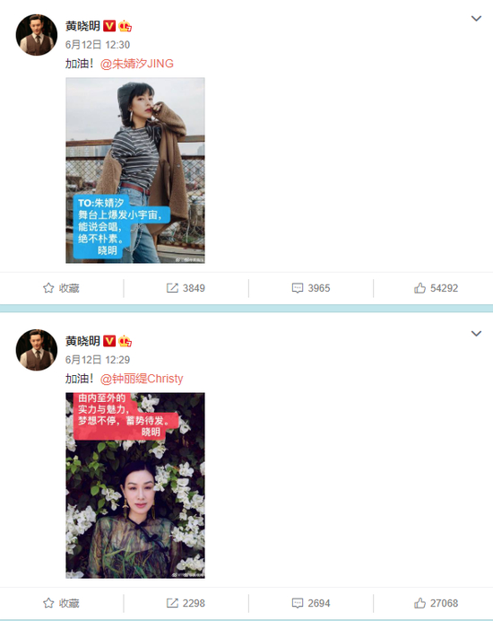 黄晓明也一改“我不要你觉得,我要我觉得”的霸道总裁范,乖巧表示“我就是来伺候大家的”,并连发30条微博为30位姐姐打call,顺序都是按照姓氏首字母排序,配上专属应援祝福,满满的求生欲,被网友戏称:《乘风破浪的姐姐》实际是晓明历险记实锤。