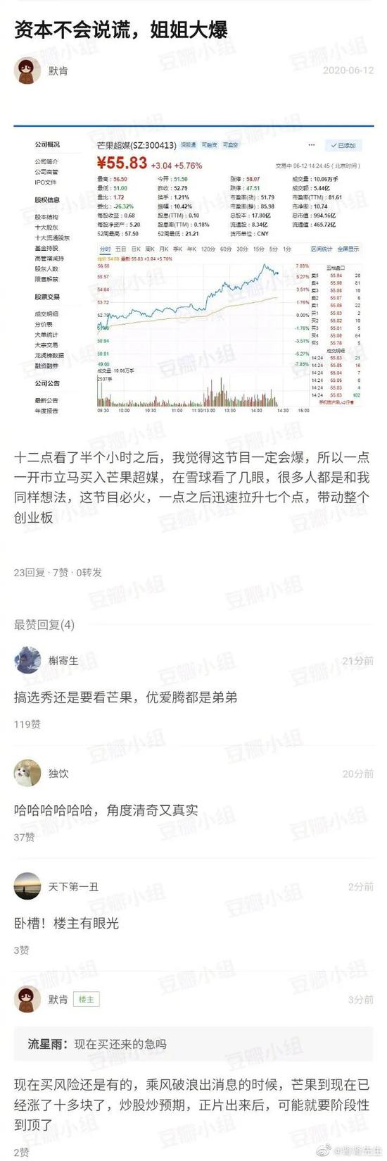 播放量迅速破亿;社交网络上与节目相关的话题迅速刷屏;节目播出当天到今天收盘,芒果超媒的股票迅速上涨,市值破千亿……