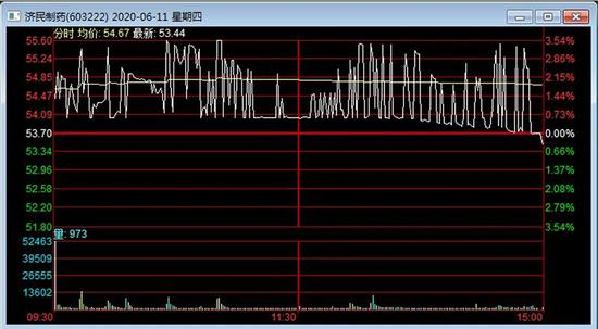 6月11日,济民制药在股价高位爆出历史天量,全天成交15.54亿元。回顾济民制药当天走势,日内分时图呈现连续“锯齿形震荡”。