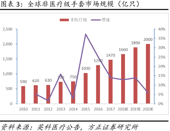 根据中国塑协和马来西亚手套行业协会数据,2019 年度全球医疗级手套市场规模达到3060亿只,非医疗级手套市场规模达到1890亿只,手套行业整体保持 8-10%的稳健增长。鉴于疫情带来防护需求的增长,马来西亚手套协会预计2020 年行业需求增长将上调为 20%左右(HIN1 疫情期间增长约17%),Top Glove(顶级手套)公司首席执行官也预计疫情后行业正常的需求增速由既有的8-10%增至12-15%左右。