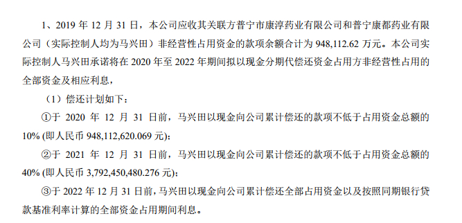 根据康美药业披露信息,康美药业实际控制人马兴田向康美药业出具了不可撤销的《债务代偿计划承诺书》,拟以现金、中药材和其他资产偿还资金占用方非经营性占用的全部公司资金,分三年偿还全部占用资金。