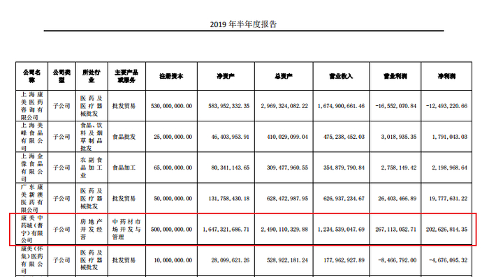 而根据康美药业2019年半年度报告,康美中药城(普宁)公司的报告期末总资产有24.9亿元,净资产为16.47亿元。仅2019年上半年,这家公司的营业收入就有12.3亿元,净利润2亿元。