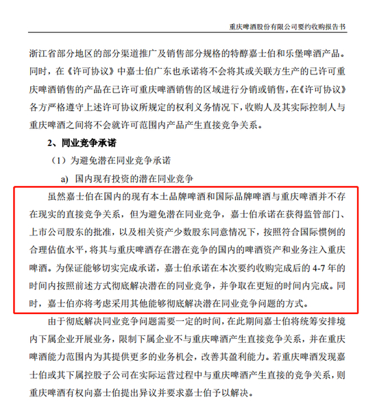 2013年,嘉士伯香港通过部分要约收购的方式,收购重庆啤酒30.29%的股份时,嘉士伯向重庆啤酒作出过一项关于同业竞争问题的承诺,即:为避免潜在同业竞争,其在获得监管部门、上市公司股东的批准,以及相关资产少数股东同意情况下,在要约收购完成后的4至7年时间内,将其与上市公司存在潜在竞争的国内的啤酒资产和业务注入上市公司。