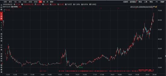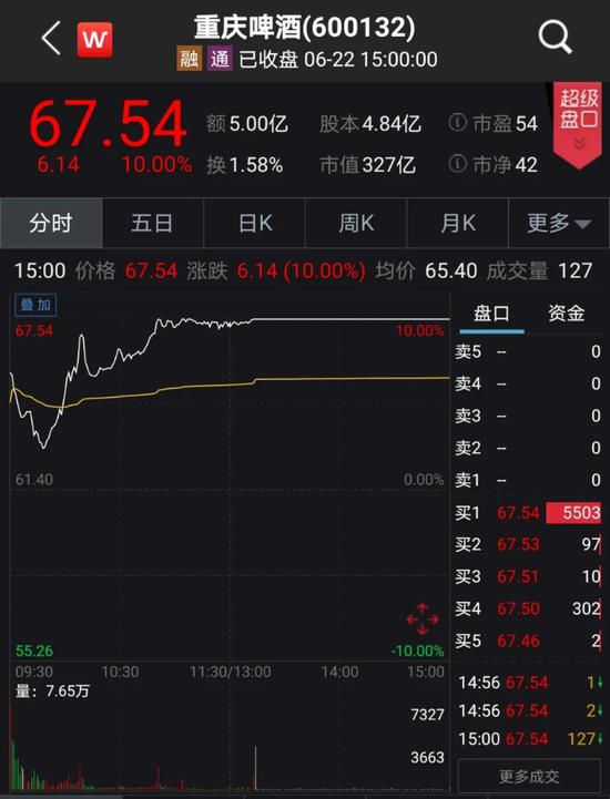 除了股票涨停外,重庆啤酒的股价在今天也站上了67.54元(前复权)的高位,创下自2011年11月25日以来的历史新高。