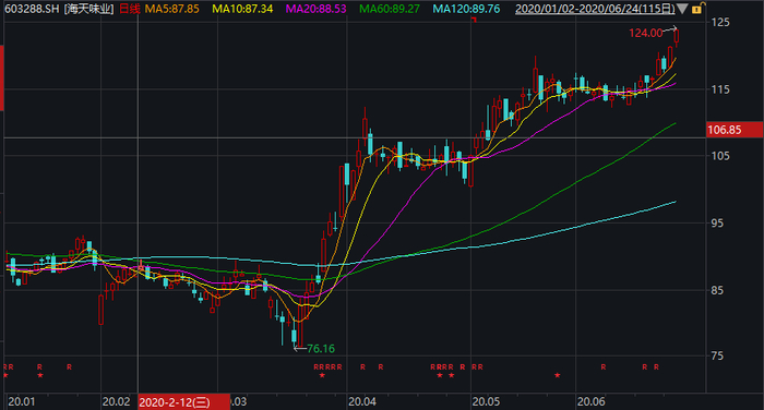 6月24日,海天味业股价再创新高,盘中一度升至124元/股。截至收盘,该股上涨2.06%,报123.8元/股,最新总市值突破4000亿元,达到4011.67亿元。