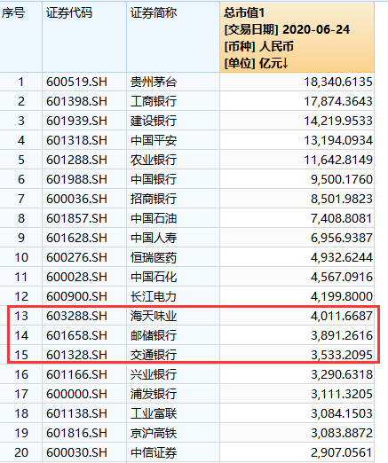 就上交所上市公司而言,邮储银行、交通银行两大国有银行最新总市值均排在排名之后。,分别为3891.26亿元、3533.21亿元。